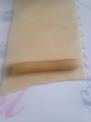 Abaisser la pâte en une rectangle et couper des bandes de 8cm de largeur . Faire des boudins avec la farce de 7cm de largueur .