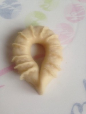 Donner au boudin la forme d'un oeil en reliant les bouts et les souder en pinçant . Dessiner le tour avec la pince comme sur les photos . Badigeonner de blanc d'oeuf et placer une amande au centre . Procéder de la même façon avec les autres gâteaux , jusqu'à épuisement de la pâte .