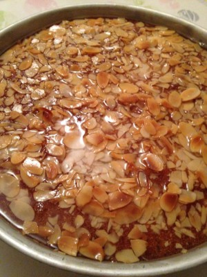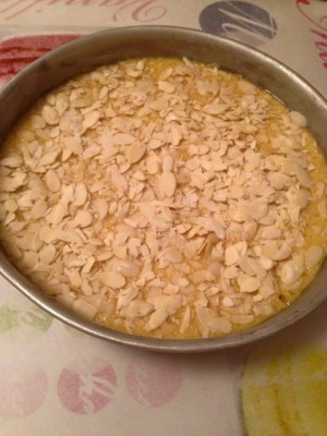 Préparer la pâte : mélanger tous les ingrédients de celle-ci sauf la semoule et la levure , puis les ajouter en dernier . Beurrer un plat pour le four à bords hauts et verser la préparation dedans . Parsemer d'amandes éffilées et enfourner jusqu'à ce que la basboussa est une belle couleur dorée . Vérifier en piquant le centre du gâteau avec la pointe d'un couteau .