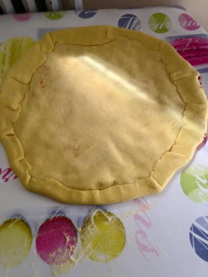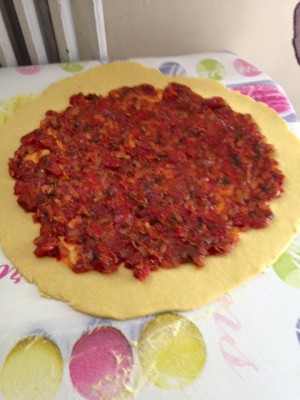 Préparer la farce : Emincer les oignons , couper les tomates le plus finement possible et faire revenir le tout dans une poêle avec l'huile d'olive . Ajouter le concentré de tomate, le piment , les herbes et assaisonner puis couvrir et laisser cuire à feu doux 30/40mn en remuant régulièrement . Laisser refroidir , et ne préparer la pate que lorsque la farce sera froide .