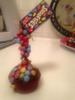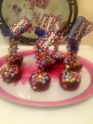 Recouvrir les cupcakes du chocolat restant, piquer les mikado recouverts de smarties au centre et coller les smarties restants sur les cupcakes de façon à se que ça donne bien l'effet d'une boîte renversée. Placer ensuite les petites boîtes sur le haut des mikados.