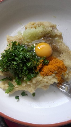 Dans un saladier, réduire les pommes de terre en purée au presse purée ou à la fourchette, surtout pas au mixeur, puis y ajouter tous les ingrédients sauf les oeufs qu'il faut ajouter un à un selon le pouvoir d'absorbtion des pommes de terre. Si le mélange est trop liquide, ajouter de la chapelure ou de la maizéna. Bien malaxer et rectifier l'assaisonnement.