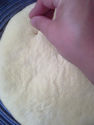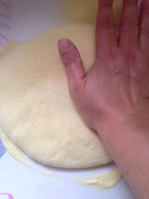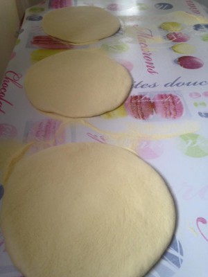 Lorsque le temps de pause est passé , dégazer la pâte et la repétrir 3/4 mn en la jetant plusieurs fois avec force sur le plan de travail afin de l'attendrir . Reformer une boule et la replacer dans le plat huiler et recouvrir comme la fois précédente . Laisser de nouveau poser jusqu'à ce qu'elle est tripplée de volume . Redégazer la pâte et la diviser en 3 parts égales et former 3 boules . Saupoudrer généreusement le plan de travail de semoule et étaler les boules en galettes d'environ 1 cm d'épaisseur . Les espacer un peu et les saupoudrer de semoule , puis couvrir de torchons propres et laisser lever 1H30 .
