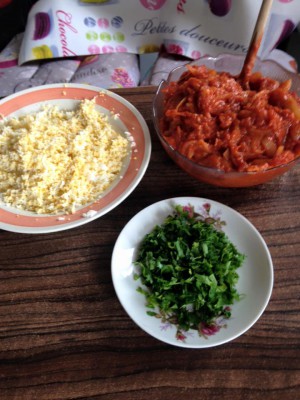 Pendant ce temps préparer la farce ; inciser les tomates en 4 sur le dessous puis les plonger 1 mn dans l eau bouillante et enlever leur peau puis les couper en petits dés. Peler et émincer les oignons, les faire revenir dans l huile avec les tomates , le paprika , le piment et assaisonner à votre goût. Au bout de 5 mn baisser le feu au minimum et ajouter le concentré de tomates et laisser cuire 1h en remuant de temps en temps . Ajouter de l' eau au besoin. Râper les oeufs et hâcher le persil. Quand la farce est prête laisser la refroidir.