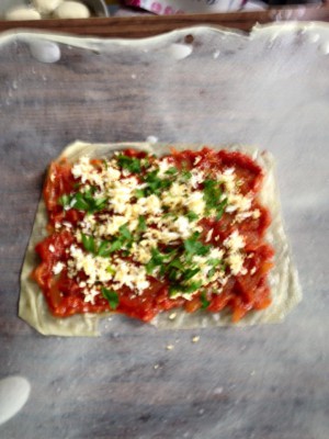 Passer ensuite à la réalisation des mhajeb. Huiler le plan de travail, prendre une boule de pâte et l'étaler finement du bout des doigts puis l' étirer en soulevant les côtés délicatement. Mettre un carré de pâte précuite au centre et garnir de farce de tomates, puis parsemer d oeufs râpés et de persil, et replier en portefeuille. Faire cuire sur votre tajine 2/3mn de chaques cotés, répéter l opération pour chaques mhajeb. Bonne réalisation !