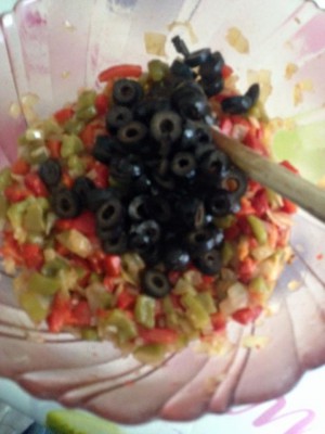 Pendant ce temps mettre les poivrons dans le four à chaleur maximum sur la grille. Les retourner de temps en temps que tous les côtés soient bien grillés . Les placer ensuite dans un sac en plastique fermé et laisser refroidir . Une fois tiédis leur enlever la peau , les couper en 2, ôter les grains et couper en petits dés . Hâcher les oignons et les faire blondir dans l huile d olive puis les ajouter aux poivrons avec l ail râpé. Assaisonner, et ajouter un peu d huile d olive et les olives coupées en rondelles. Placer au frais.