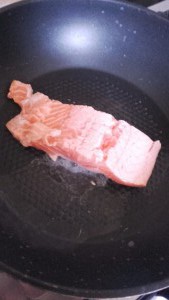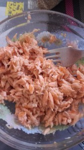 Pendant ce temps, faire cuire le pavé de saumon à sec 7/8mn selon l'épaisseur. Le mettre dans un bol, retirer les éventuelles arrêtes et l'émietter. Ajouter le furycake et bien mélanger. Rectifier l'assaisonement.