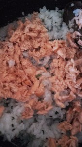 Lorsque le riz est cuit, le transvaser dans un saladier et l'aérer avec une cuillére jusqu'à ce qu'il soit tiède (pas froid), ajouter le saumon et bien le mélanger.