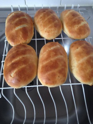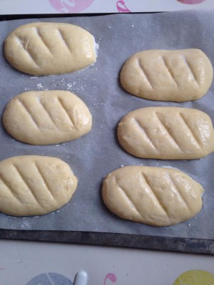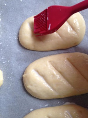 Badigeonner les petits pains de lait à l'aide d'un pinceau , puis faire de petites incisions avec un couteau ( voir photos) , puis enfourner la 1 ère plaque , environ 20mn , jusqu'à une belle coloration dorée . A la sortie du four , laisser refroidir les pains au lait sur une grille , et enfourner la 2 ème plaque et procéder de la même façon .