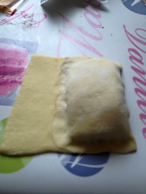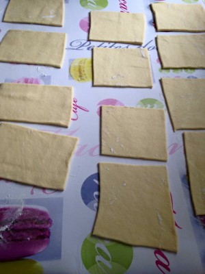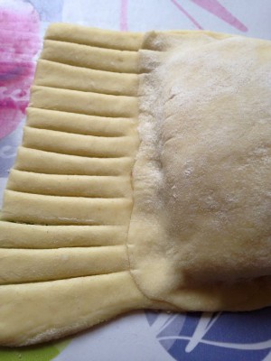 Reprendre la pâte qui a du doubler de volume et la dégazer . Fariner le plan de travail et l'étaler en un grand rectangle . Couper ensuite en bandes puis en rectangles d'environ 15 sur 12cm .
