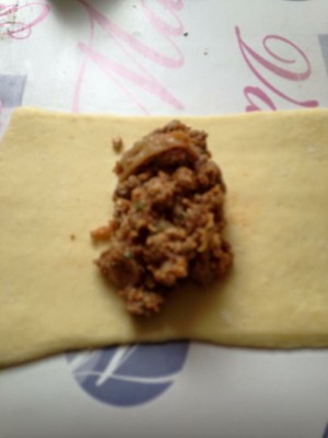Prendre un 1er rectangle de pâte et mettre 1 cuillère à soupe de farce au milieu . Recouvrir d'une demi tranche de fromage et rabattre le côté droit sur la farce et souder avec de l'oeuf battu à l'aide d'un pinceau . Couper des bandes avec le côté gauche de pâte et rabattre les bandelettes sur le milieu (voir photos) puis badigeonner d'oeuf . Faire de même pour les autres petits pains .