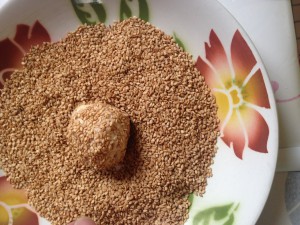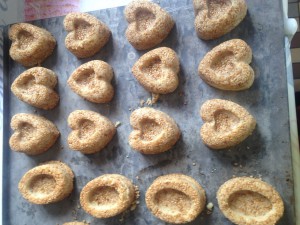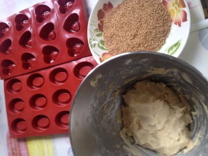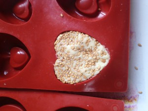 Battre le beurre et le sucre en pommade , ajouter la vanille et incorporer la farine petit à petit jusqu'à obtention d'une pâte souple . Former des boules de 25/30g (faire le test dans un moule) puis les rouler dans le sésame et placer dans les moules en tassant bien . Enfourner jusqu'à coloration dorée .