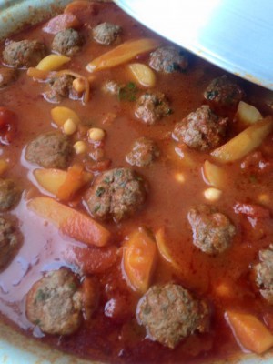 Sujet: TAJINE DE KEFTA , POMMES DE TERRE ET POIS CHICHE en sauce rouge